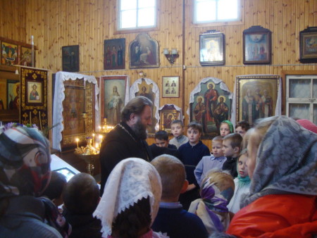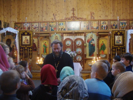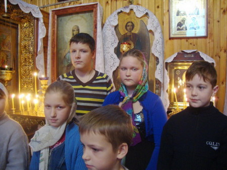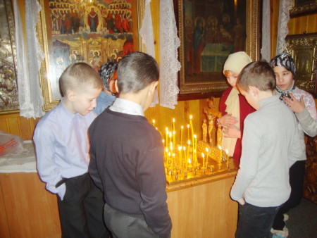Батюшка рассказал детям об истории храма св. Николая Чудотворца Мирликийского и церкви св. Николая Чудотворца, действующей сейчас. Ребята познакомились с внутренним устройством и убранством храма. Интерес вызвал у детей рассказ отца Димитрия о местночтимых иконах «Божией Матери Иверская» и «Тихвинской Иконе Божией Матери». Рассказал батюшка о церковных праздниках, о Таинствах Православной Церкви. Отец Димитрий отметил, что Таинство есть видимое священное действие, которое при помощи известного обряда сообщает верующему невидимую, но действенную благодать Божию. В Крещении человек таинственно рождается в духовную жизнь; в Миропомазании получает благодать возвращающую и укрепляющую; в Причащении питается духовно; в покаянии врачуется от духовных болезней (от грехов).