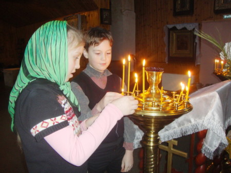 Многие дети в храме были впервые. Им рассказали, как правильно возжигать свечу, креститься и молиться у икон.